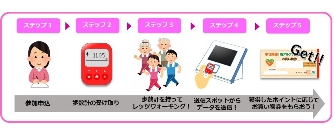 新規参加者には、歩数計(オムロンヘルスケア社製)をプレゼントし、日々の歩数をカウントしていただきます。歩いた歩数に応じてポイントが付与され、獲得ポイントに応じてお買い物券をプレゼントします。